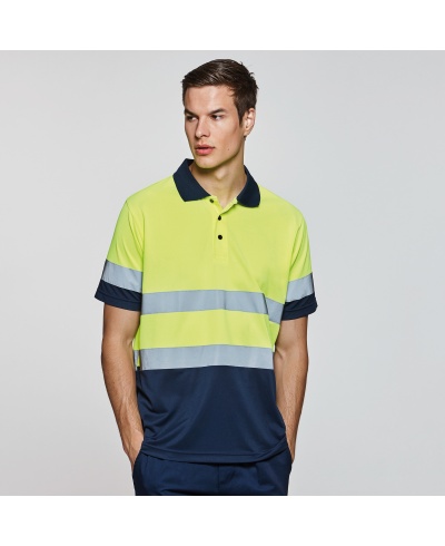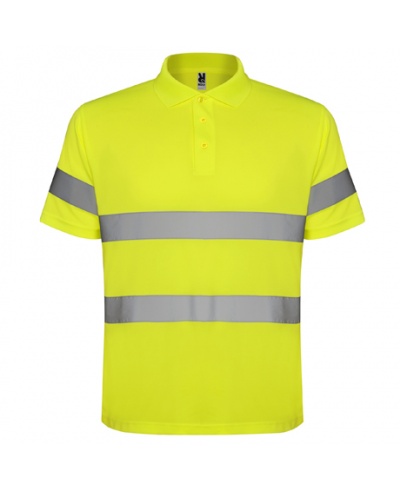 Hochsichtbares Funktions Polo-shirt mit kurze Ärmel. 1x1 Rippstrickbündchen am Kragen und Manschetten. 3-er Knopfleiste, zwei reflektierende Streifen an Brust und eine am Ärmel. Anti-Scratching Gewebe.