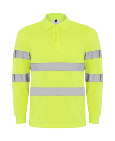 Hochsichtbares Funktions Polo-shirt mit langen Ärmeln. 1x1 Rippstrickbündchen am Kragen und Manschetten. 3-er Knopfleiste, zwei reflektierende Streifen auf Brust und einen auf den Ärmeln. Anti-Scratching Gewebe.