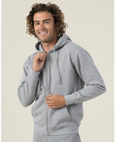 Kapuzenpullover mit durchgehender Reißverschlussabdeckung und Kängurutasche.