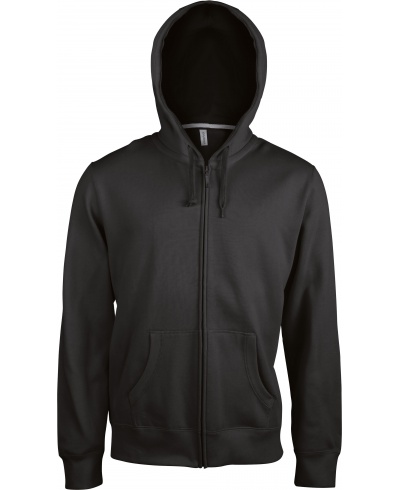 80% gekämmte Baumwolle / 20% Polyester. Gebürstetes Fleece. Verstärktes Kontrast-Nackenband (Heather Grey für alle Farben, Middle Grey für Oxford-Grey). Kängurutasche. Gerippt an Bund und Saum. Gefütterte Kapuze in Kontrastfarbe innen und Kordelzug. YKK® Reißverschluß.