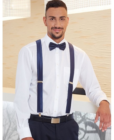 Hosenträger aus Krawattenstoff, leicht glänzend und mit feiner Streifenstruktur – ein Blickfang und ein stylishes Accessoire, das jedes Outfit auf originelle Weise veredelt. Kann farblich perfekt mit Krawatten und Fliegen abgestimmt werden. Länge verstellbar, Breite 3,5 cm.