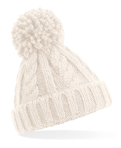 Tear-away Label für einfaches Neulabeln, Schwerer Kabelstrick in Melange, Handgestricktes Griffgefühl, Einfarbige Bommel, Atmungsaktive und komfortable Baumwoll-Jersey-Fütterung, Aufschlagdesign zur optimalen Verzierung
