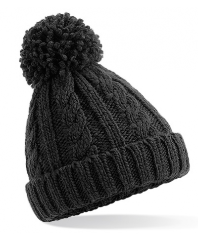 Tear-away Label für einfaches Neulabeln, Schwerer Kabelstrick in Melange, Handgestricktes Griffgefühl, Einfarbige Bommel, Atmungsaktive und komfortable Baumwoll-Jersey-Fütterung, Aufschlagdesign zur optimalen Verzierung