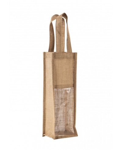 Jute-Flaschenbeutel mit 2 Tragegriffen und PVC-Klarsichtfenster an der Vorderseite. Für 1 Flasche.
