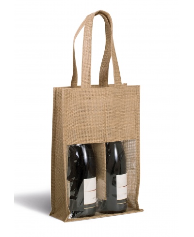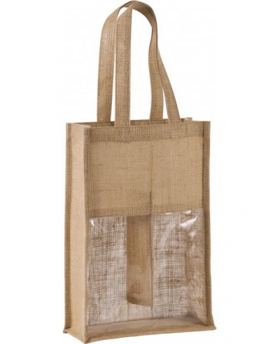 Jute-Flaschenbeutel mit 2 Tragegriffen und PVC-Klarsichtfenster an der Vorderseite. Für 2 Flaschen.