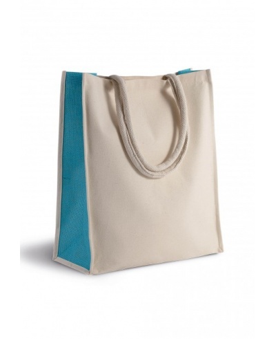 Shoppingtasche aus 310 g/m² Baumwollcanvas mit kontrastfarbenen seitlichen Jute-Einsätzen 300 g/m². Naturweiße Baumwoll-Tragegriffe 55 cm lang. Fassungsvermögen: 23 L.