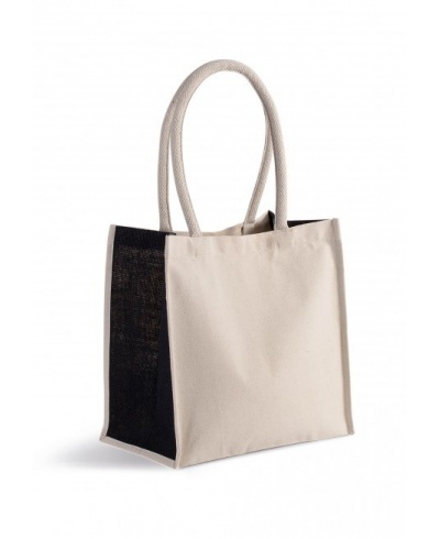Shoppingtasche aus 310 g/m² Baumwollcanvas mit kontrastfarbenen seitlichen Jute-Einsätzen 300 g/m². 55 cm lange Baumwoll-Tragegriffe. Fassungsvermögen: 17 L.