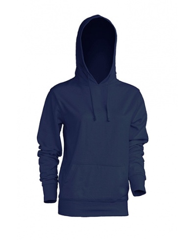 Damen Hoody mit Känguruh Taschen. Kapuzenkordel in passender Farbe. 1x1 Ribstrickbündchen an Armen und Body.