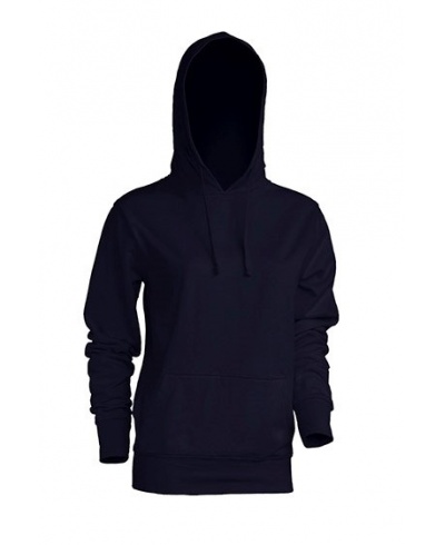 Damen Hoody mit Känguruh Taschen. Kapuzenkordel in passender Farbe. 1x1 Ribstrickbündchen an Armen und Body.