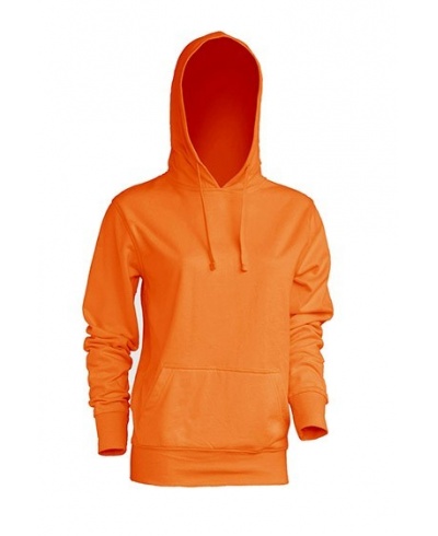 Damen Hoody mit Känguruh Taschen. Kapuzenkordel in passender Farbe. 1x1 Ribstrickbündchen an Armen und Body.