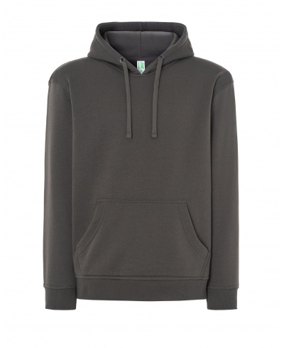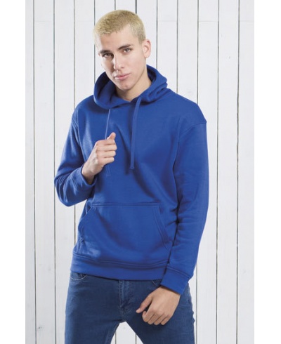 Hooded Sweatshirt, innen gebürstet. Kordeln in passender Farbe. Känguru Taschen. Doppelte Nähte an 1/1 Rib Bündchen und 1/1 Rib Bund, alle mit Lycra verstärkt.