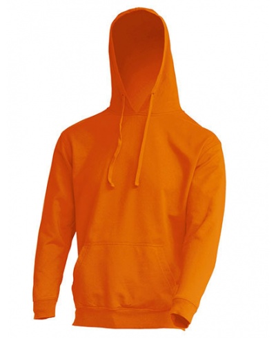 Hooded Sweatshirt, innen gebürstet. Kordeln in passender Farbe. Känguru Taschen. Doppelte Nähte an 1/1 Rib Bündchen und 1/1 Rib Bund, alle mit Lycra verstärkt.