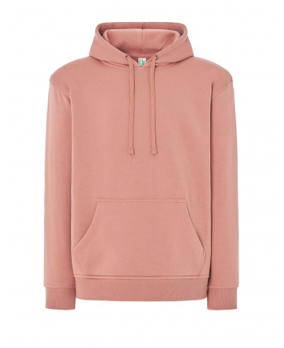 Hooded Sweatshirt, innen gebürstet. Kordeln in passender Farbe. Känguru Taschen. Doppelte Nähte an 1/1 Rib Bündchen und 1/1 Rib Bund, alle mit Lycra verstärkt.