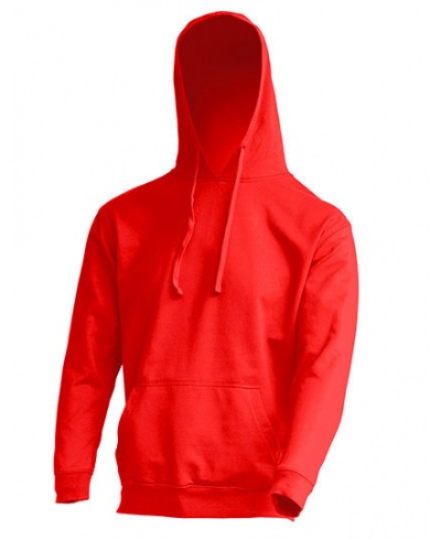 Hooded Sweatshirt, innen gebürstet. Kordeln in passender Farbe. Känguru Taschen. Doppelte Nähte an 1/1 Rib Bündchen und 1/1 Rib Bund, alle mit Lycra verstärkt.