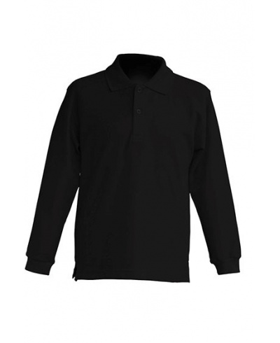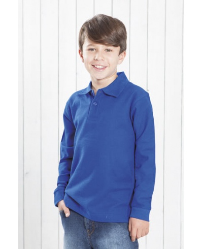 Kinder Polo-Piquee Unisex Shirt, langer Arm, verstärkte Seitenschlitze. Doppelte Nähte an Kragen, Ärmeln und Bund, 2 Knöpfe. Lycra im Ribkragen und Armbündchen, Nackentape Schulter zu Schulter.