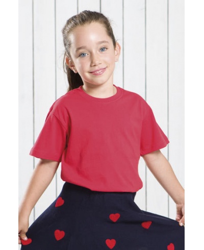 Kinder Premium T-Shirt, kurzer Arm, Seitennähte. Doppelte Nähte an Kragen, Ärmeln und Bund. Lycra im Ribkragen, Nackentape Schulter zu Schulter. Ash Melange: 98% Baumwolle / 2% Polyester.