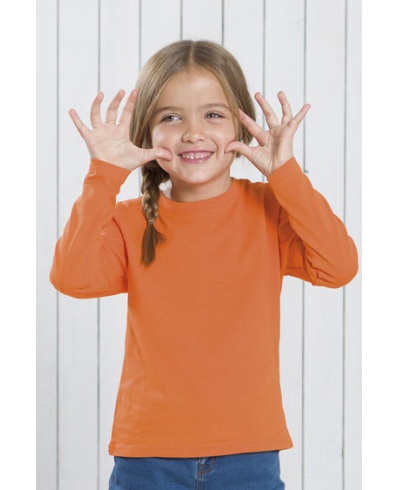 Langärmeliges T-Shirt für Kinder. Seitennähte am Körper. Lycra Rippenhals. Doppelnaht an Kragen, Ärmeln und Boden. Schulter zu Schulter Band. Grey Melange: 85% Baumwolle / 15% Polyester.