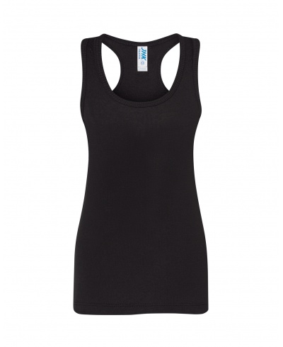 Girly Tank Top T-Shirt mit Rückenausschnitt im Schwimmer Design. Gerippter Abschluss 1x1. Schulter mit geripptem Abschluss 2x1. Schwimmdesign und rückwärtige Falte