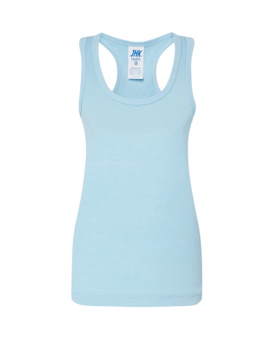 Girly Tank Top T-Shirt mit Rückenausschnitt im Schwimmer Design. Gerippter Abschluss 1x1. Schulter mit geripptem Abschluss 2x1. Schwimmdesign und rückwärtige Falte