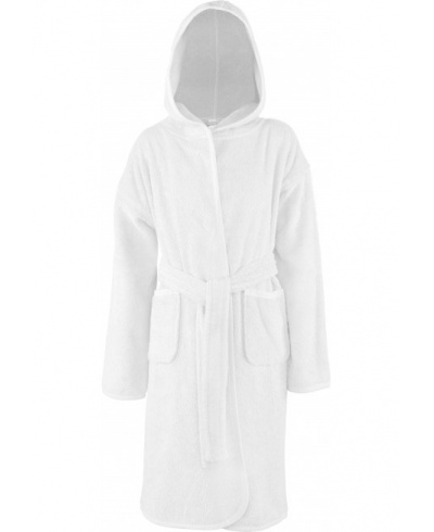 100% Walkfrottier-Baumwolle. Mit Kapuze. 2 aufgesetzte Fronttaschen. Gürtel hinten befestigt.
