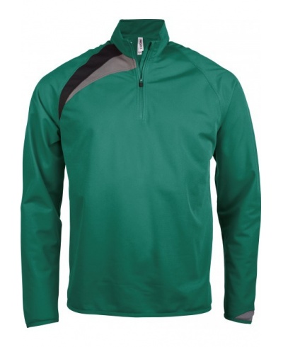 100% gebürstetes Polyester. 1/4 Reißverschluß am Kragen. Einsätze in Kontrastfarbe. Nähte in Kontrastfarbe. Elastische Bündchen an Hüfte und Ärmeln.