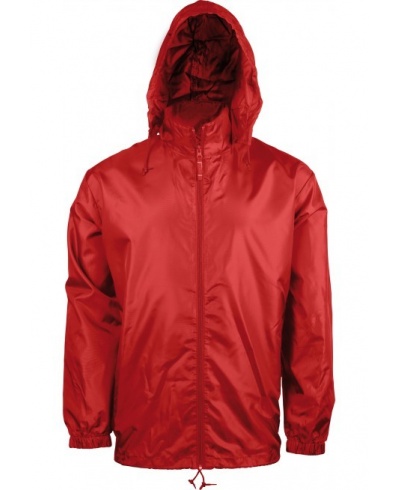 100% Polyester. Farblich abgestimmter Reißverschluß. Im Kragen verdeckte Kapuze mit Klettverschluß. 2 Fronttaschen mit Reißverschluß. Gummizug an Ärmelbund. Kann in eine Fronttasche hinein gefaltet werden (K-Way®-System).
