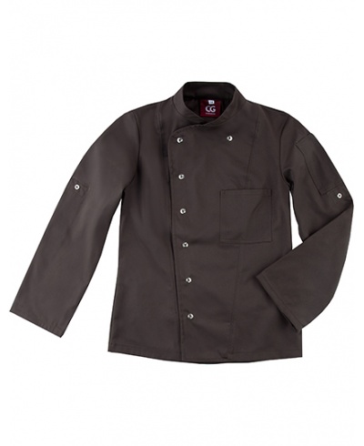 Trendige Kochjacke, für die Damen leicht tailliert, mit praktischen Druckknöpfen, Brusttasche und Ärmeltasche. Die Ärmel können aufgekrempelt und mit Schlaufe und Druckknopf fixiert werden. Eine Rückenfalte sorgt für Bewegungsfreiheit. 95° C waschbar, pflegeleicht, knitterarm, farbecht, industriewäsche- und finishertauglich.