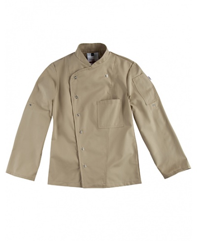 Trendige Kochjacke, für die Damen leicht tailliert, mit praktischen Druckknöpfen, Brusttasche und Ärmeltasche. Die Ärmel können aufgekrempelt und mit Schlaufe und Druckknopf fixiert werden. Eine Rückenfalte sorgt für Bewegungsfreiheit. 95° C waschbar, pflegeleicht, knitterarm, farbecht, industriewäsche- und finishertauglich.