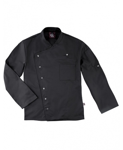 Trendige Kochjacke mit praktischen Druckknöpfen, Brusttasche und Ärmeltasche. Die Ärmel können aufgekrempelt und mit Schlaufe und Druckknopf fixiert werden. Eine Rückenfalte sorgt für Bewegungsfreiheit. 95° C waschbar, pflegeleicht, knitterarm, farbecht, industriewäsche- und finishertauglich.