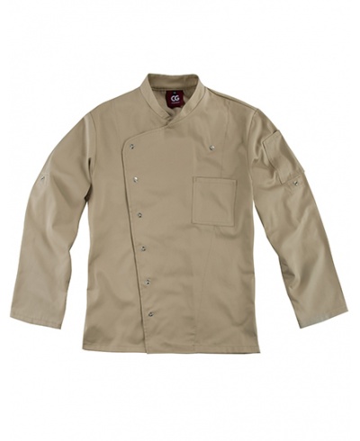 Trendige Kochjacke mit praktischen Druckknöpfen, Brusttasche und Ärmeltasche. Die Ärmel können aufgekrempelt und mit Schlaufe und Druckknopf fixiert werden. Eine Rückenfalte sorgt für Bewegungsfreiheit. 95° C waschbar, pflegeleicht, knitterarm, farbecht, industriewäsche- und finishertauglich.