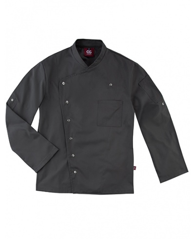 Trendige Kochjacke mit praktischen Druckknöpfen, Brusttasche und Ärmeltasche. Die Ärmel können aufgekrempelt und mit Schlaufe und Druckknopf fixiert werden. Eine Rückenfalte sorgt für Bewegungsfreiheit. 95° C waschbar, pflegeleicht, knitterarm, farbecht, industriewäsche- und finishertauglich.