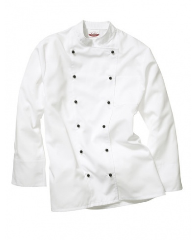 Klassische Kochjacke aus strapazierfähigem Mischgewebe. Brusttasche, Langarm mit geschlitzten Manschetten. 12 Kugelknöpfe in schwarz inklusive. 95° C waschbar, knitterarm, pflegeleicht, farbecht, industriewäsche- und finishertauglich.