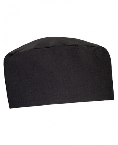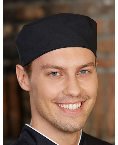 Modische flache Kochmütze mit Gummizug hinten, dadurch variabel im Umfang. Bundhöhe 7,5 cm. 95° C waschbar, pflegeleicht, farbecht, industriewäsche- und finishertauglich.