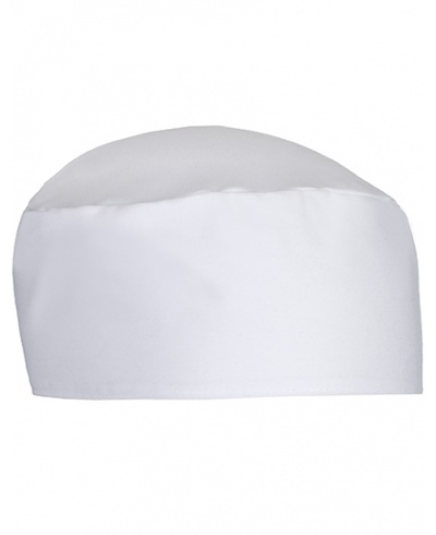 Modische flache Kochmütze mit Gummizug hinten, dadurch variabel im Umfang. Bundhöhe 7,5 cm. 95° C waschbar, pflegeleicht, farbecht, industriewäsche- und finishertauglich.
