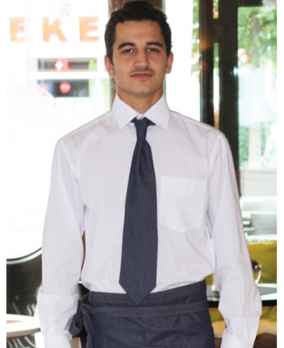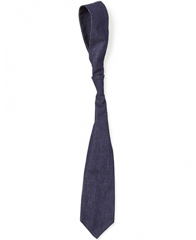 Krawatte aus strapazierfähigem Jeansgewebe. Mit einer Schlaufe, die aussieht wie ein Krawattenknoten, kann sie schnell und einfach befestigt werden.