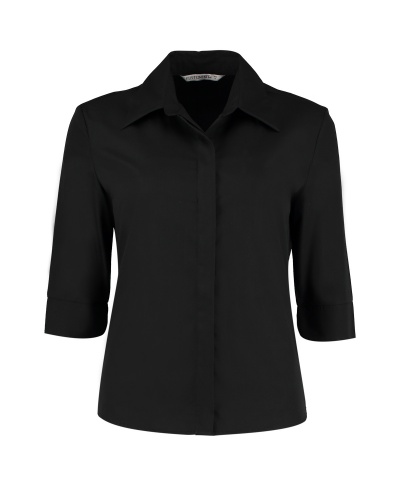 115 g/qm • 65% Polyester, 35% Baumwolle • Verdeckte Knopfleiste • 3/4 lange Ärmel • Manschette mit Schlitz • Tailliert (Abnäher am Rücken) • Bügelleicht • Abgerundeter Saum.