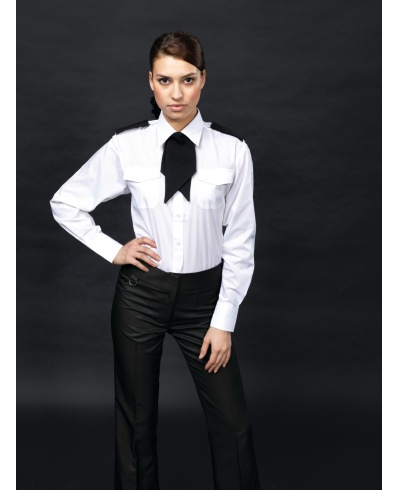 Clip-Krawatte für Damen, wird mit einem Stahlclip am Kragen befestigt. Eine praktische Lösung für Mitarbeiterinnen im Sicherheitsdienst, da sie die Gefahr der Strangulierung eliminiert.