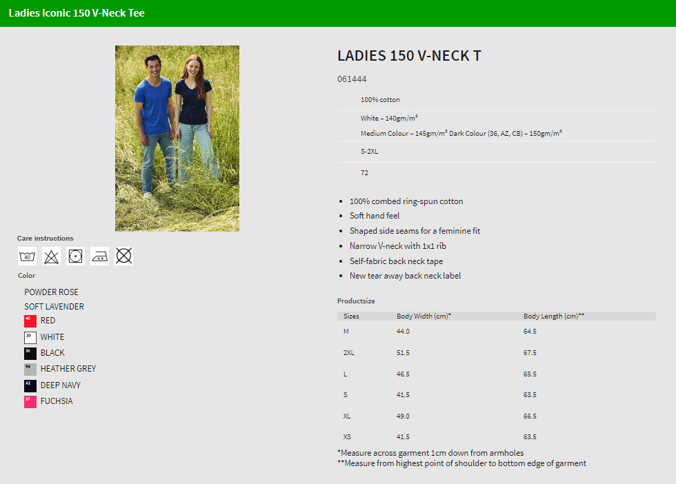 Material: 100% Baumwolle; Gewicht: 150 g/m² (weiß - 140 g/m²); 100 % gekämmte, ringgesponnene Baumwolle, weicher Griff, geformte Seitennähte für eine feminine Passform, V-Ausschnitt mit schmalem 1x1-Ripp, Nackenband aus dem gleichen Stoff, neues abreißbares Nackenetikett; Zertifikate: STANDARD 100 by OEKO-TEX®; WRAP