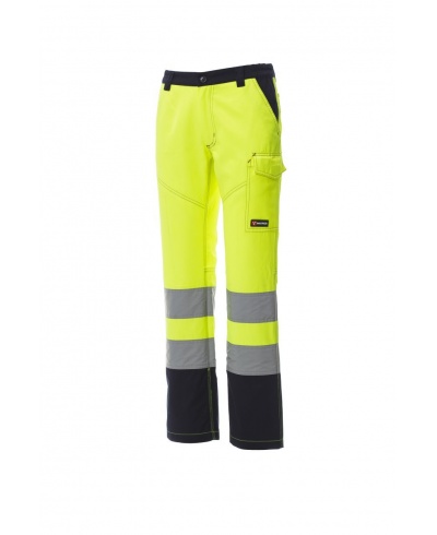 Ganzjährig tragbare Damen-Warnschutz-Hose, Reflexstreifen, seitlich dehnbarer Bund und Gürtelschlaufen, Hosenschlitz mit Reißverschluss und Kunststoffknopf, 2 klassisch geschnittene Vordertaschen, 1 Seitentasche mit LOCK SYSTEM, Zollstocktasche, 1 offene Gesäßtasche und 1 mit Patte und Klettverschluss. Nähte in Kontrastfarbe, Dreifachnähte im Schritt und am Innenbein