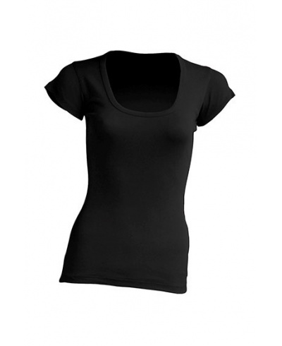 Damen T-Shirt, tailliert. Kurze, angeschnittene Ärmel, tief ausgeschnitten.