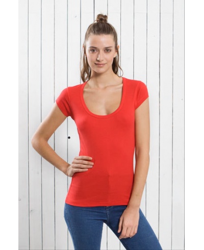Damen T-Shirt, tailliert. Kurze, angeschnittene Ärmel, tief ausgeschnitten.