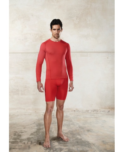 88% Polyester / 12% Elasthan "Quick Dry". Rundhalsausschnitt. Nähte farblich abgestimmt. Doppelnaht an Handgelenk und Hüfte.