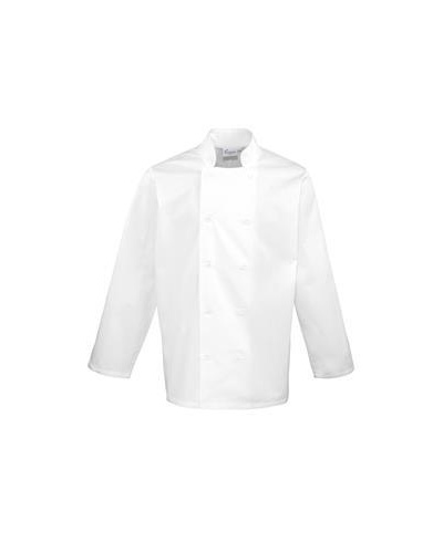Eine Kochjacke mit langen Ärmeln und Wickelverschluss mit zehn Knöpfen. Um den Anforderungen wiederholten Waschens standzuhalten, bestehen die Knöpfe aus langlebigem Harz. Mit Stehkragen gestylt.