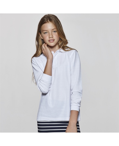 Langarm Kinder Poloshirt. 2er-Knopfleiste, gleichfarbige Knöpfe. Kragen mit Verzierung und Ärmelbündchen aus 1x1 Rippstrick. Nackenband. Seitenschlitze.
