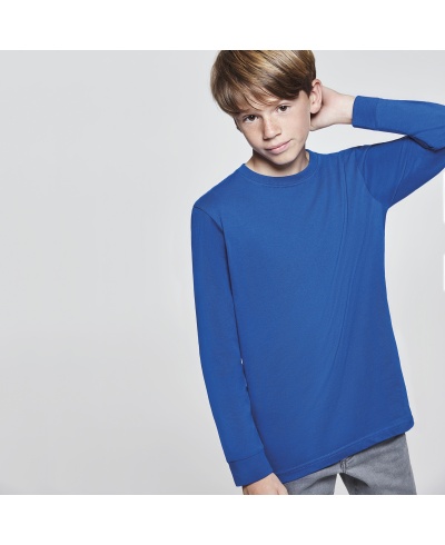 Kinder Langarm T-Shirt. Rundhalskragen 4-lagig. Elastische 1x1 Rippenbündchen an den Ärmeln. Durchgehendes Nackenband von Schulter zu Schulter.