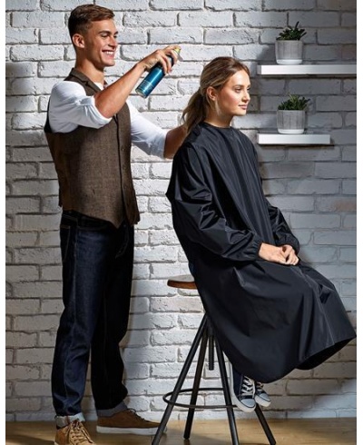 Dieses langärmlige Salonkleid ist eine willkommene Ergänzung unserer wasserdichten Kollektion. Es passt vorne und lässt sich mit einem verstellbaren Klettverschluss sauber um den Nacken schließen. Die langen Ärmel sind mit elastischen Bündchen versehen, die den Kunden Bewegungsfreiheit bieten.