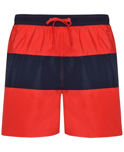 Badeshorts, Blockstreifen und elastisches Bündchen mit farbigem Kordelzug in Kontrastfarben. Seitentaschen. Gesäßtasche mit verdecktem Reißverschluss. Doppelnähte. Netzfutter bei Innenhose und Taschen.