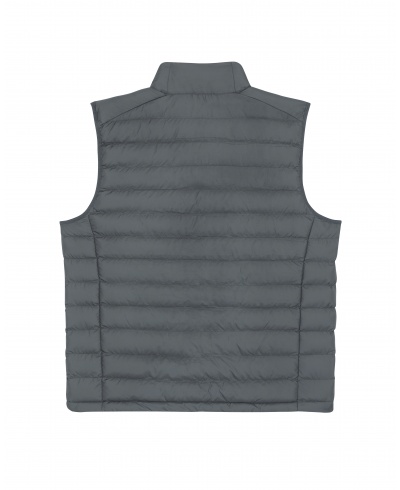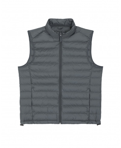 Material: 100 % recyceltes Polyester, fluorfreie DWR; Gewicht: 75g/m²; Taillierter, ärmelloser, hoher Kragen, umgekehrter Nylon-Reißverschluss vorne in der Mitte, Leistentaschen mit Reißverschluss und zusätzlichem Grosgrain-Puller, elastisches Band am Armloch, vollständig gesteppt, Seiteneinsätze für eine bessere Form, innen eingefasste Nähte, unterer Saum mit verstellbarem Kunststoffstopper und elastischer Kordel; Zertifikate: Global Recycled Standard (GRS), Fair Wair, STANDARD 100 by OEKO-TEX®, Peta - Approved VEGAN