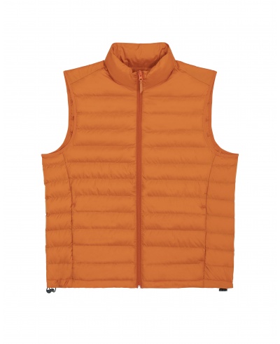 Material: 100 % recyceltes Polyester, fluorfreie DWR; Gewicht: 75g/m²; Taillierter, ärmelloser, hoher Kragen, umgekehrter Nylon-Reißverschluss vorne in der Mitte, Leistentaschen mit Reißverschluss und zusätzlichem Grosgrain-Puller, elastisches Band am Armloch, vollständig gesteppt, Seiteneinsätze für eine bessere Form, innen eingefasste Nähte, unterer Saum mit verstellbarem Kunststoffstopper und elastischer Kordel; Zertifikate: Global Recycled Standard (GRS), Fair Wair, STANDARD 100 by OEKO-TEX®, Peta - Approved VEGAN