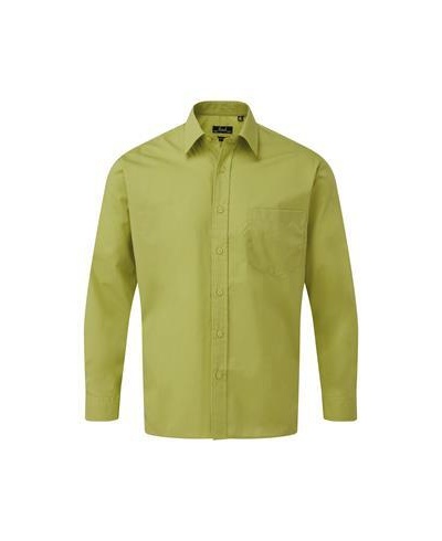 Ein langärmliges Popeline-Hemd für Herren, erhältlich in 27 Farben. Dieses klassische Arbeitshemd hat einen versteiften, formellen Kragen und eine offene Gehrungstasche auf der linken Brust. Der langärmlige Stil hat geknöpfte Manschetten,
